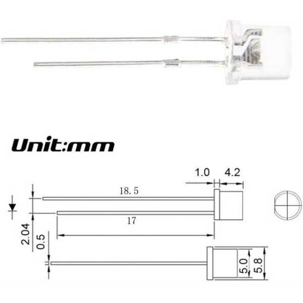 - Boyut: 18mm bacak uzunluğuna sahip 5mm düz LED