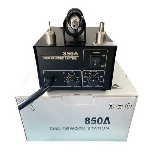 The 850A Hot Air Soldering Station is a highly efficient tool designed for precision soldering and desoldering tasks. With adjustable temperature and air flow settings, this station allows for controlled heat application, making it perfect for delicate electronic components, surface-mount technology (SMT) soldering, and repair work. Its durable construction and ergonomic design make it ideal for both professionals and DIY enthusiasts working in electronics and electrical assembly.