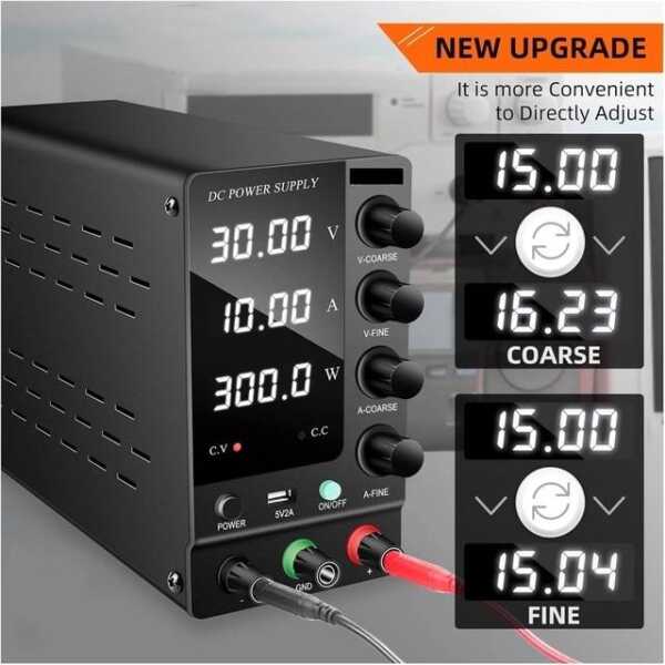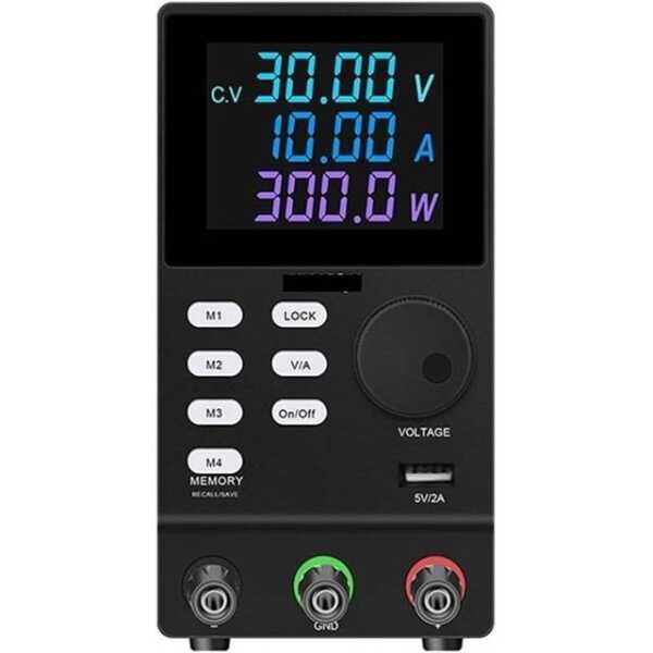 The Black SPPS3010D offers a color screen and adjustable output of 30V and 10A, designed for use with a 110V US plug, making it ideal for various electronic applications.