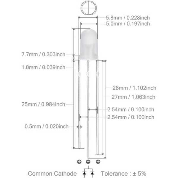 The Diffused 28mm Leg 5mm LED Water Clear Red+Pure Green CC is a dual-color LED with common cathode (CC) design, featuring both red and pure green light in a single 5mm diffused lens. Operating at 2V and 20mA, this LED provides soft, evenly distributed red and pure green light, making it ideal for indicator lights, low-power circuits, and custom electronics projects requiring color control.