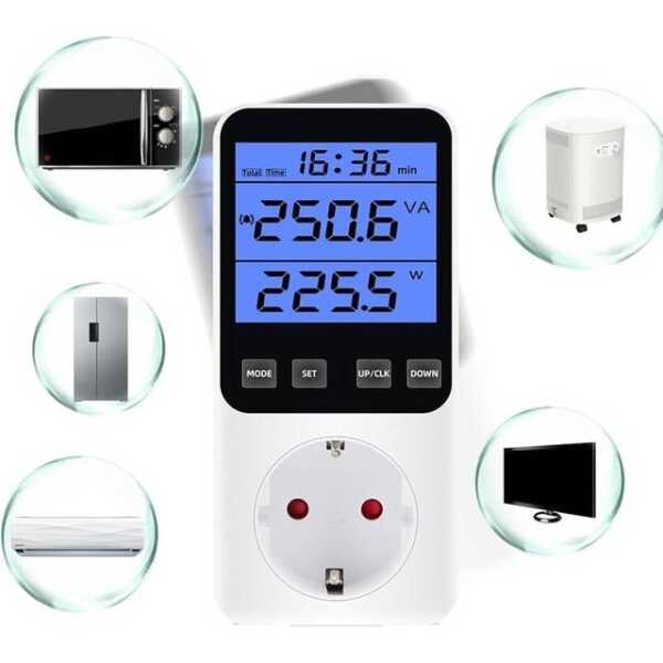 The Digital LCD Power Meter Socket with a Brazilian plug measures power consumption up to 2300W at 230V. It comes equipped with an LCD display and a backup battery for continuous power monitoring, even during outages, making it suitable for residential and commercial use.