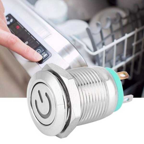 The Flat Head 12mm 12-24V Waterproof Self-Locking Metal Push Button Switch features a durable design and a bright green LED light. This self-locking switch is ideal for various applications and operates effectively in wet conditions.