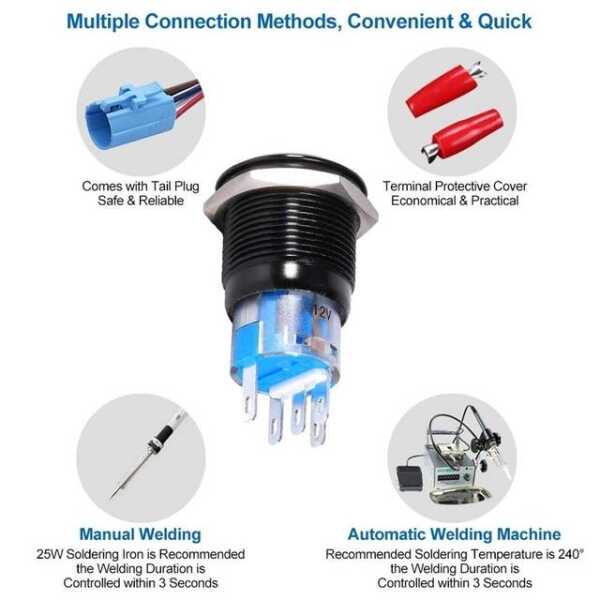 The Flat Head 19mm 12-24V Waterproof Self-Locking Metal Push Button Switch with blue LED light offers secure and reliable on/off control. The blue LED provides bright visibility, and the self-locking mechanism ensures the switch stays in place until manually turned off. Its waterproof construction guarantees durability in both indoor and outdoor environments.