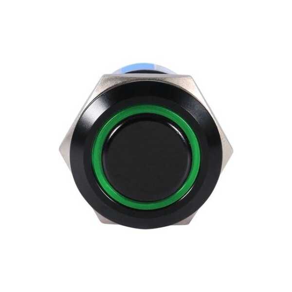 The Flat Head 19mm 12-24V Waterproof Self-Locking Metal Push Button Switch with green LED light and switch socket button connector is designed for high-voltage control systems. The self-locking feature keeps the switch pressed until manually released, and the waterproof construction ensures reliable performance in harsh environments.