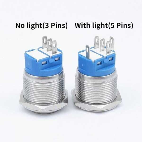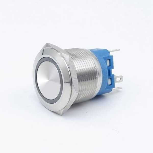 The Flat Head 22mm 110-220V Waterproof Momentary Self-Reset Metal Push Button Switch with blue LED light and switch socket button connector offers dependable high-voltage control. Its momentary self-reset function allows the switch to return to its default position after each press, making it suitable for continuous operation in various environments.