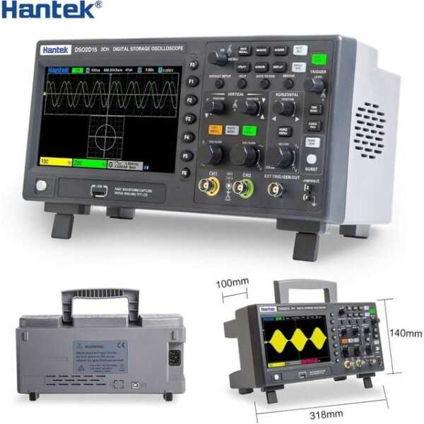 The Hantek DSO2D15 is a powerful oscilloscope featuring a bandwidth of 150MHz and two channels, along with a built-in signal generator. This model includes an EU plug for compatibility with European systems.