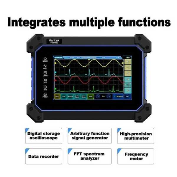 The Hantek TO1112 Touch Screen Digital Oscilloscope combines advanced features with user-friendly design. It has a bandwidth of 110MHz, a sampling rate of 250MSa/s, and an 8M storage depth, making it ideal for a wide range of electronic testing applications.