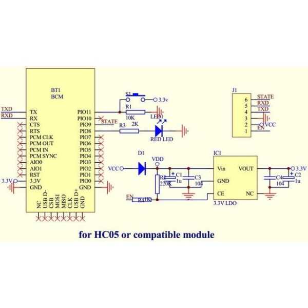 - 6 Pin Interface: Includes TX, RX, VCC, GND, EN (enable), and STATE (connection status) pins.