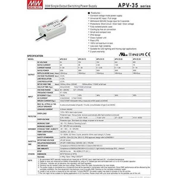 The Original Taiwan MEAN WELL APV-35-12 Waterproof Power Supply delivers 12V output with a power rating of 35W. Its waterproof design makes it ideal for outdoor and industrial applications, providing consistent performance even in harsh environments.