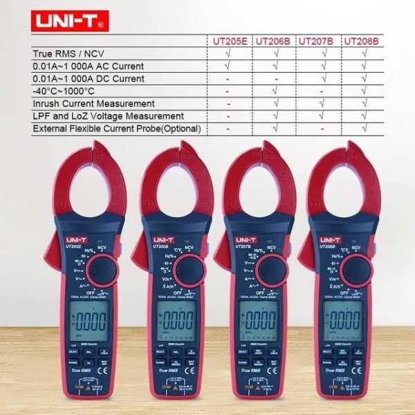 The UNI-T UT206 is a multifunctional digital clamp meter that measures AC/DC current, voltage, and resistance. This version does not include a battery, allowing users to choose their preferred power source.