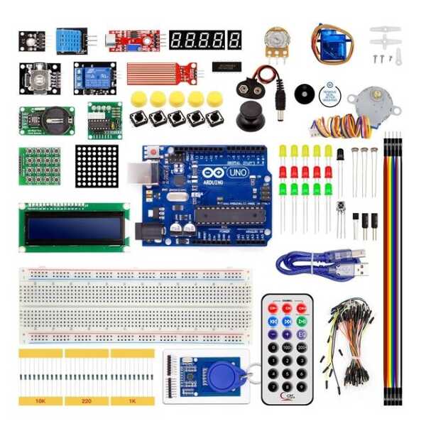 - Arduino UNO R3 Board: Includes the official Arduino UNO R3 board with the logo, perfect for learning microcontroller programming and building a wide range of projects.