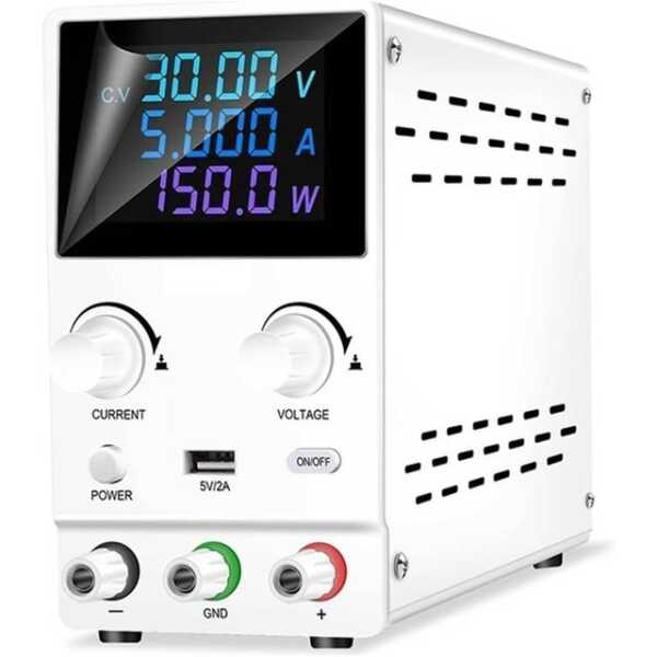 The White SPPS-B305D provides dual knob control for voltage and current adjustment, offering a maximum output of 30V and 5A. Designed for a 110V US plug.