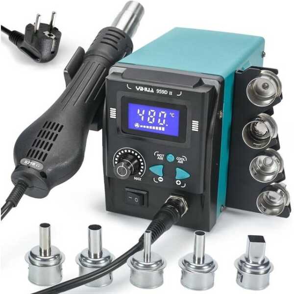 The YIHUA959D-II Digital Display Hot Air Soldering Station operates at 220V and provides precise temperature control for effective soldering tasks. Designed for users in Europe, this station features a digital display for easy operation.