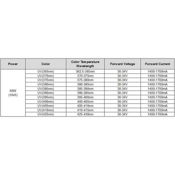 50W SMD Yüksek Güçlü LED Ampul 365-370nm Mor Teknik Özellikler