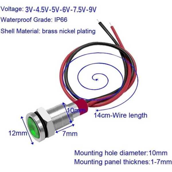Kırmızı 3-9V 10mm LED Metal Gösterge Işığı, 15cm Kablolu Teknik Özellikler
