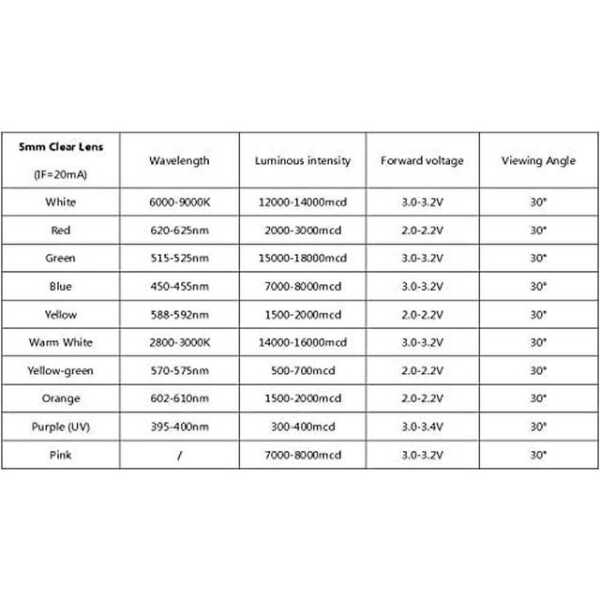 - Boyut: 28mm bacak uzunluğuna sahip 5mm düz LED