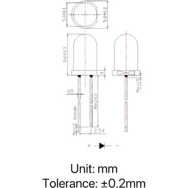 - Boyut: 28mm bacak uzunluğuna sahip 5mm LED