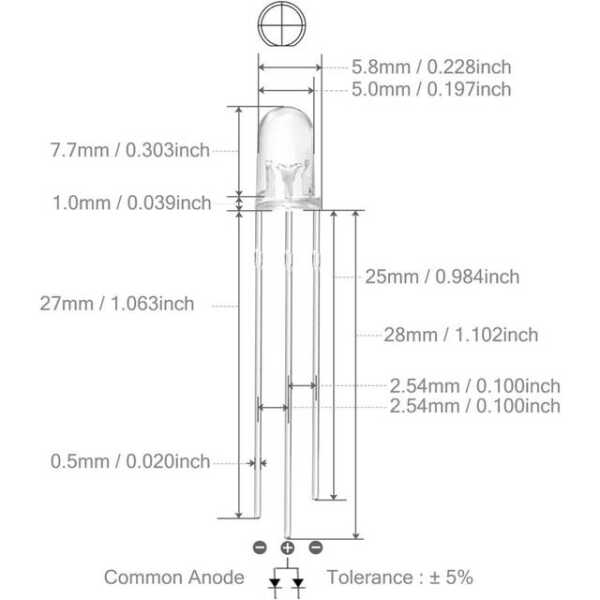 - Boyut: 18 mm bacak uzunluğuna sahip 5 mm LED