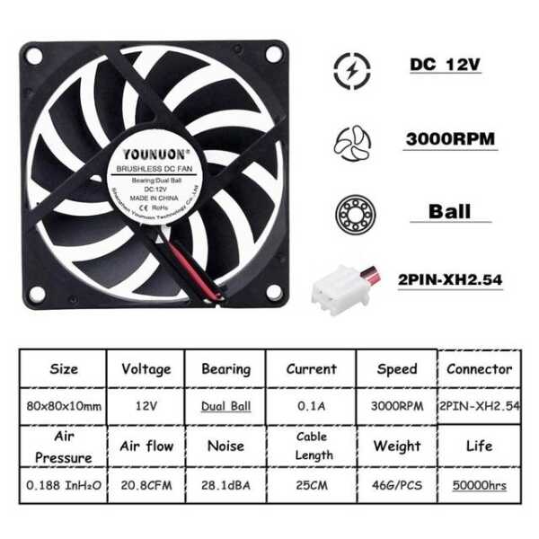 DC5V 8010 Çift Bilyalı Soğutma Fanı Çift bilyalı rulman sistemi ile dayanıklı ve verimli soğutma sağlar. Bu fan, XH2-54-2P konektörü ve 30 cm kabloyla donatılmıştır; bu da onu 5V sistemlerde tutarlı hava akışı gerektiren küçük elektroniklerin soğutulması için ideal kılar.
