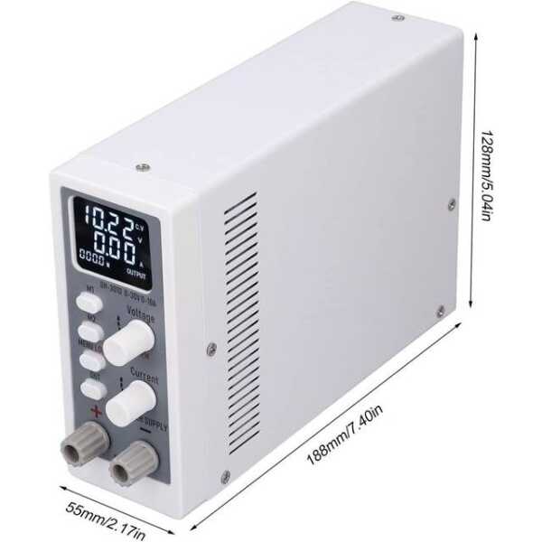 Beyaz SPPS305D, renkli bir ekran ve 30V ve 5A ayarlanabilir çıkış sağlar ve aşağıdakilerle kullanılmak üzere tasarlanmıştır: 110V ABD fişi, onu çeşitli elektronik uygulamalar için ideal kılar.