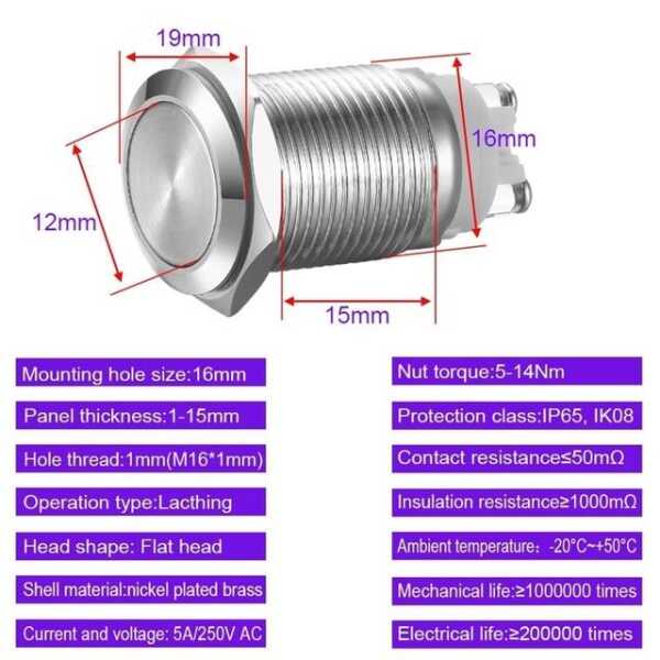 Düz Kafa 16mm 3-6V 5A Su Geçirmez Kendinden Kilitli Metal Basmalı Düğme Anahtarı, Sarı Ledli Hafif Düz Kafa 16mm 3-6V 5A Su Geçirmez Kendinden Kilitli Metal Basmalı Düğme Anahtarı, Sarı Led Işıklı Özellikleri