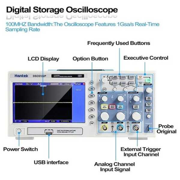 Hantek DSO5102P, 100MHz bant genişliğine ve çift kanal işlevselliğine sahip çok yönlü bir dijital osiloskoptur. Bu model, Birleşik Krallık elektrik sistemleriyle uyumluluk için bir Birleşik Krallık fişi içerir.