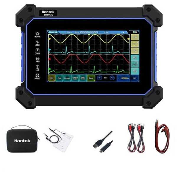 Hantek TO1112D Dokunmatik Ekranlı Dijital Osiloskop + Multimetre ABD fişli, çok yönlü testler için çift işlevsellik sağlar. 110MHz bant genişliğine, 250MSa/s örnekleme hızına sahiptir ve 25M sinyal kaynağı içerir.
