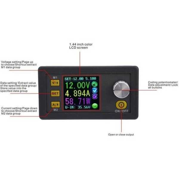 Kademeli düşürücü voltaj dönüştürücüsü oldukça verimlidir ve kararlı çıkış sağlarken minimum enerji kaybını garanti eder. RD DPS5005, çıkış voltajınızı, akımınızı ve gücünüzü gerçek zamanlı olarak görebilmenizi sağlayan renkli bir LCD voltmetre ile donatılmıştır. İster devre kuruyor, ister bileşenleri test ediyor, ister deneyler yapıyor olun, bu modül kompakt ve güvenilir bir pakette hassas güç sağlar.
