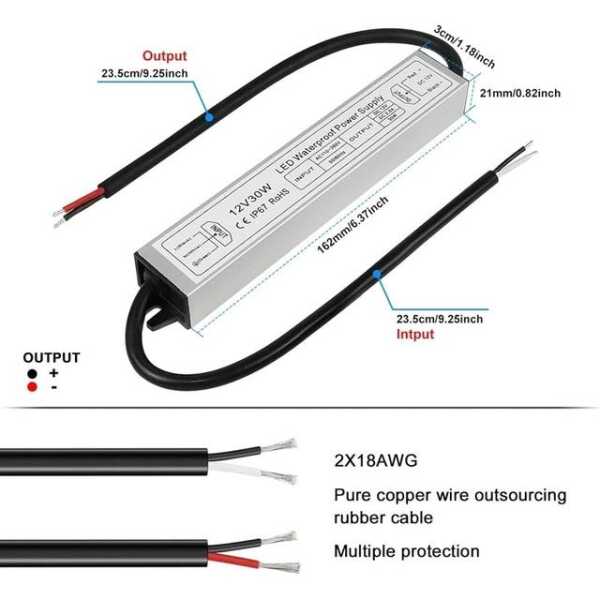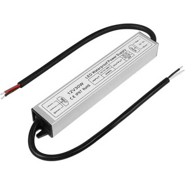 The Silver Waterproof Power Supply delivers 30W of power at 12V with a current of 2.5A, making it ideal for medium-power LED lighting systems. Its waterproof construction ensures reliable performance in wet environments, and its compact design allows for versatile installation in a variety of settings.