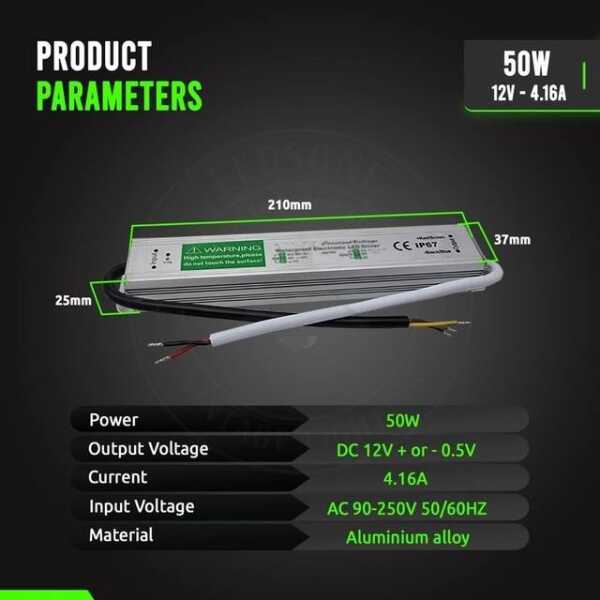 The Silver Waterproof Power Supply provides 50W of power at 12V with a 4.16A output, making it suitable for medium-power LED lighting and outdoor applications. The waterproof design ensures reliable performance in wet conditions, and the compact size allows for easy installation.