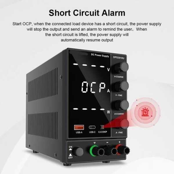 Siyah WPS605H, 60V'a kadar ayarlanabilir voltaj ve maksimum 5A akım sunan çok yönlü bir güç kaynağıdır. 220V AB fişiyle kullanılmak üzere özel olarak tasarlanmıştır.